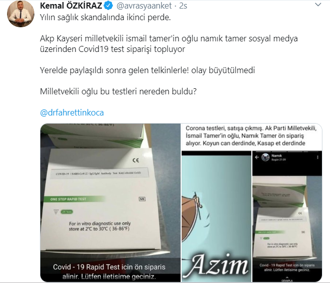 Yılın sağlık skandalında ikinci perde. Kayseri milletvekili İsmail Tamer'in oğlu Namık Tamer sosyal medya üzerinden Covid19 test siparişi topluyor.
