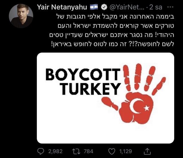 Bununla da yetinmeyen Netanyahu'nun oğlu Yair Netanyahu Twitter hesabından Türkiye ile ilgili küstah bir paylaşımda bulundu. Oğul Netanyahu paylaşımında, "İsrail'in ve Yahudi halkının yok edilmesi çağrısında bulunan Türklerden binlerce cevap alıyorum! Hâlâ tatil için oraya uçmakta olan İsrailliler aranızda ne var?" diyerek İsrail vatandaşlarına Türkiye'yi boykot etme çağrısında bulundu.