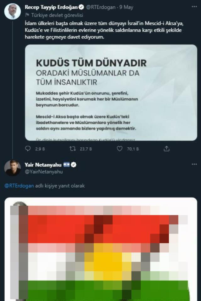 Erdoğan'ın bu paylaşımının ardından İsrail Başbakanı Benyamin Netanyahun'nun oğlu Yair Netanyahu, Cumhurbaşkanı Recep Tayyip Erdoğan'ın bu tweetinin altına skandal bir paylaşım yaptı. Netanyahu'nun oğlu, Erdoğan'ın paylaşımına sözde "Kürdistan" bayrağı görseliyle yanıt verdi.