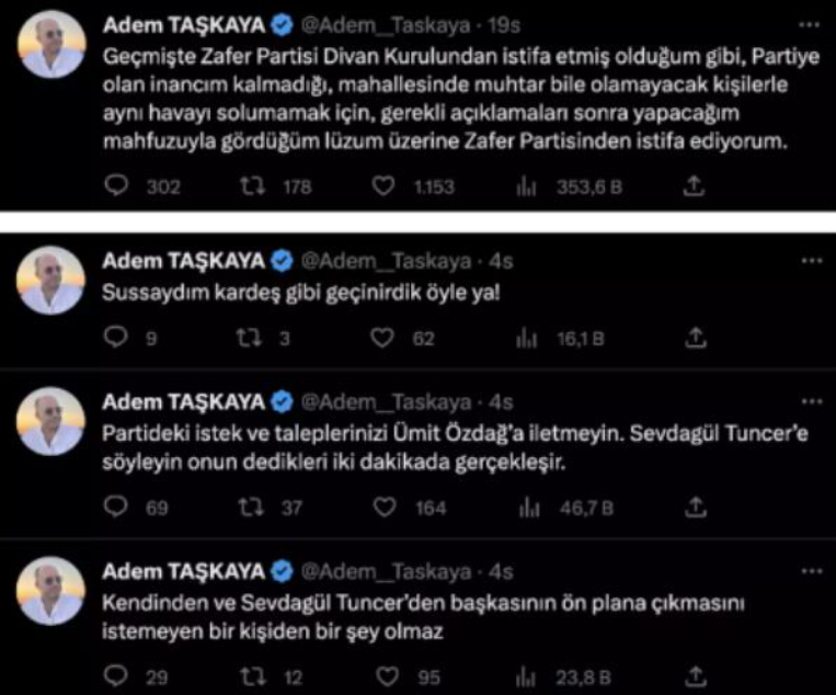 Zafer Partisi Genel Başkan Yardımcısı Adem Taşkaya, partisinden istifa etti. Aldığı kararı sosyal medya üzerinden duyuran Taşkaya, zehir zemberek sözler sarf etti.