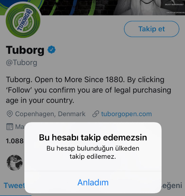 Türkiye'den, alkollü içeceklerin Twitter hesaplarını takip etmek isteyen kullanıcılar engelle karşılaştı. Danimarkalı bira üreticisi Tuborg, Twitter hesabını Türkiye'ye kapattı. Sebebi henüz bilinmeyen olay için, Twitter kullanıcıları Tuborg ve diğer alkollü içeceklerin resmi Twitter hesaplarını neden takip edemedikleriyle ilgili bir açıklama bekliyor.