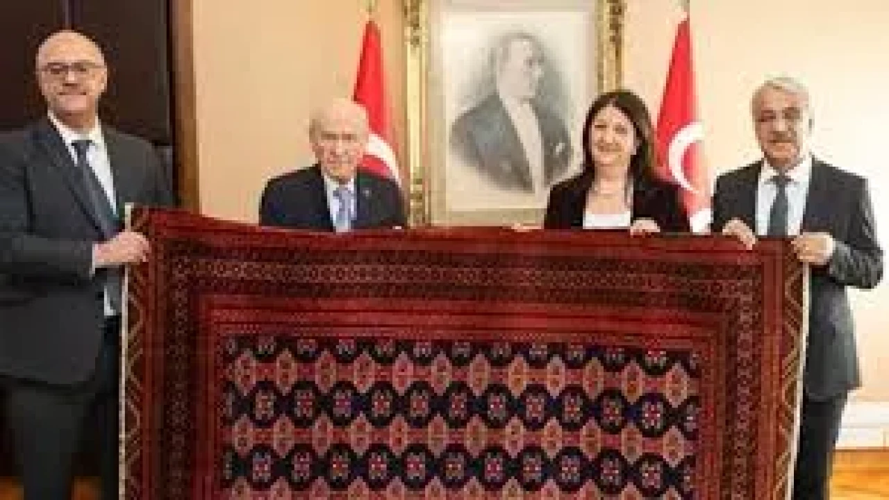 MHP Genel Başkanı Devlet Bahçeli, Abdullah Öcalan’ın Şanlıurfa’da özel olarak dokutturulan bir kilimi kendisine hediye ettiğini açıkladı. Bahçeli, söz konusu hediyenin DEM Parti heyetinin Meclis ziyareti sırasında kendilerine ulaştırıldığını bildirdi.