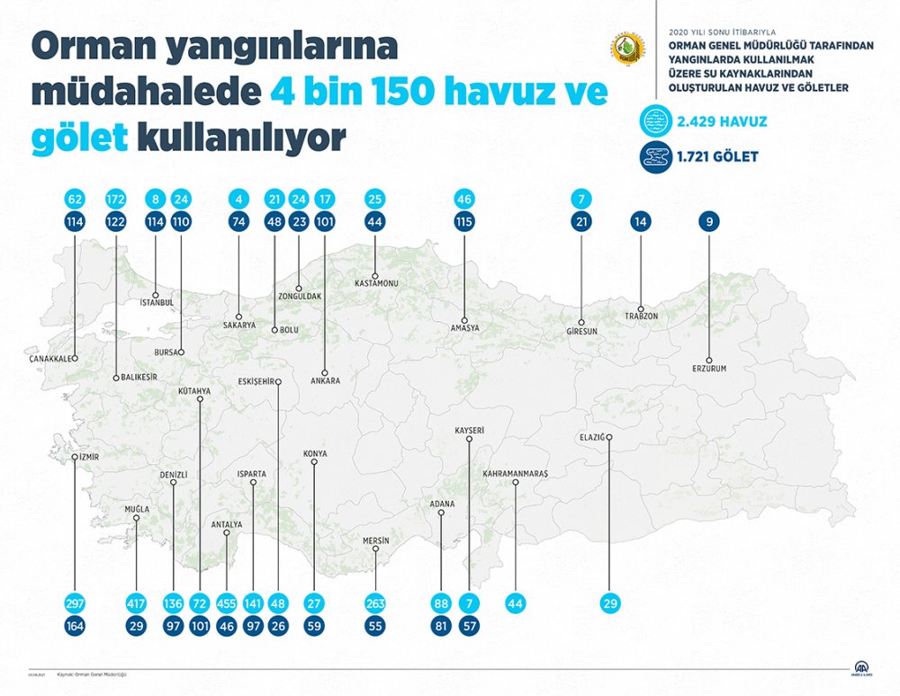 Buralar yangına müdahalede hız ve etkinlik sağlıyor. Türkiye'de toplam 2 bin 429 havuz ve 1721 gölet bulunuyor.