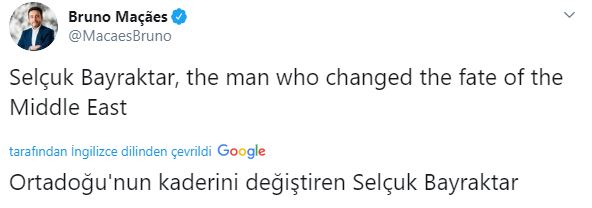 Portekizli siyaset bilimci ve Hudson Enstitüsü Araştırmacısı Bruno Maçaes, Türkiye'nin Suriye'deki büyük askeri başarısından övgüyle söz etti. Türkiye'nin gücüne güç katan ve havada büyük üstünlük kuran SİHA'lara hayranlığını gizleyemeyen Bruno Maçaes, Baykar Savunma Teknik Müdürü Selçuk Bayraktar için ''Ortadoğu'nun kaderini değiştiren adam'' değerlendirmesini yaptı.