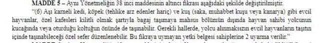 Buna göre aşı karneli kedi, köpek (tehlike arz edenler hariç) ve kuş (saka, muhabbet kuşu veya kanarya) gibi evcil hayvanlar, özel kafesleri kilitli olmak koşuluyla bagaj taşımaya mahsus bölümün dışında hayvan sahibi yolcunun kucağında veya oturduğu koltuğun önünde de taşınabilecek. Gerekli hallerde, yolcu alınmaksızın evcil hayvanların taşıtın içinde taşınabileceği özel sefer de düzenlenebilecek. Bu kurala uymayan yetki belgesi sahiplerine, 2 uyarı cezası verilecek.