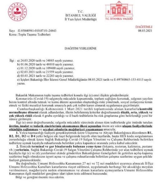 Konuyla ilgili açıklamalarda bulunan TOBB Karayolu Yolcu Taşımacılığı Sektör Meclisi Başkanı Mustafa Yıldırım, " Son olarak İçişleri Bakanlığının 8 Mart 2021 tarihinde yayınladığı genelgeyle 4925 sayılı Karayolu Taşıma Kanunu kapsamındaki taşımacılık faaliyetlerinde kapasite kısıtlaması kaldırılmıştır. Yolcular otobüsler HES kodu kontrolü yapılarak alınıyor. Otobüsler her seferinde dezenfekte ediliyor. Otobüslerde yolcular için dezenfektan ve maske bulunduruluyor. Yolcuların maske kullanımı zorunluluğu denetleniyor. Personelin her seferde ateş ölçümü yapılıyor. Ayrıca sağlık bakanlığı tarafında hazırlanan Salgın Yönetimi Çalışma Rehberi'nde tüm tedbirler uygulanıyor" dedi.