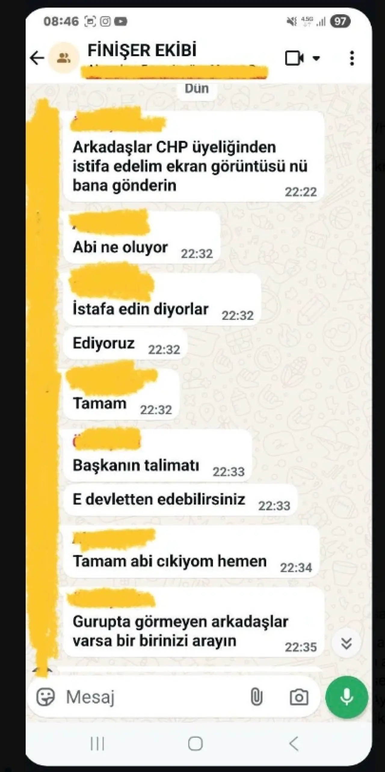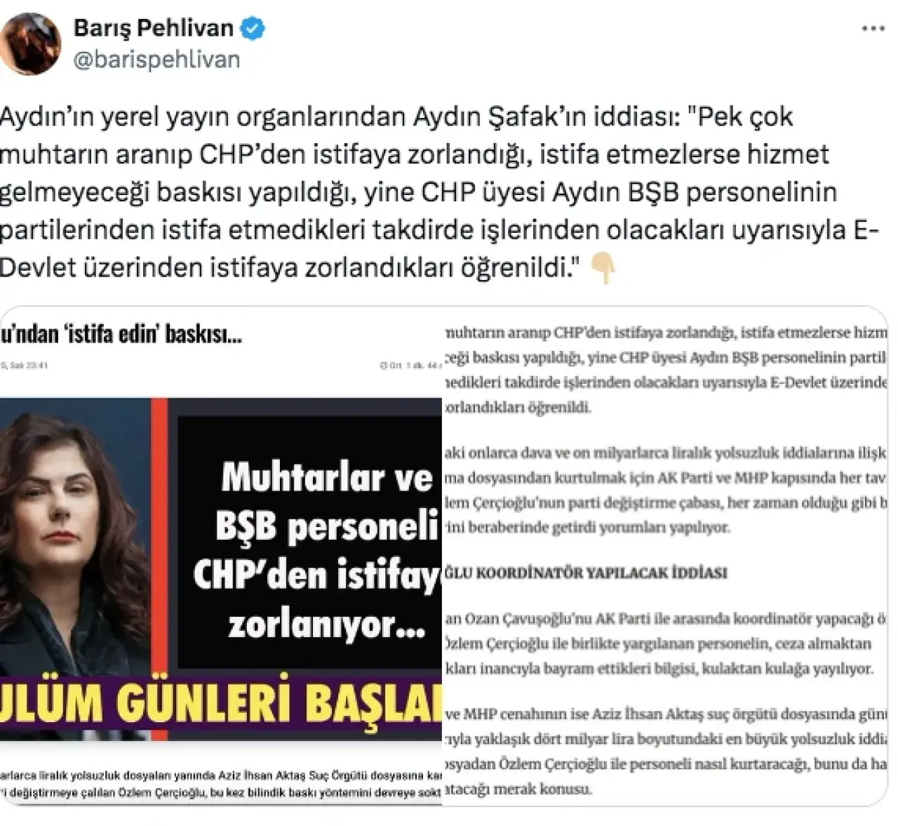 Gazeteci Barış Pehlivan, Aydın Büyükşehir Belediyesi çalışanlarına ait olduğu öne sürülen WhatsApp konuşmalarını paylaştı. Mesajlarda, belediye personelinden CHP üyeliğinden istifa etmelerinin istendiği iddia edildi. Pehlivan, yerel medyada yer alan iddiaları da X hesabından aktararak, bazı muhtarların da baskı altında olduğu öne sürüldü.