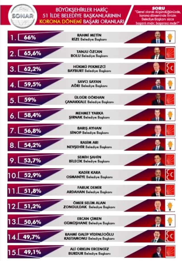 Büyükşehirler dışında kalan 51 il için yapılan "en başarılı 15 belediye başkanı" anketinde; AK Parti'den 6 belediye bulunuyor. CHP'nin de 6 belediye ile listede yer aldığı ankette; MHP'nin 15 kent içerisinde başarılı bulunan sadece 3 belediyesi oldu.