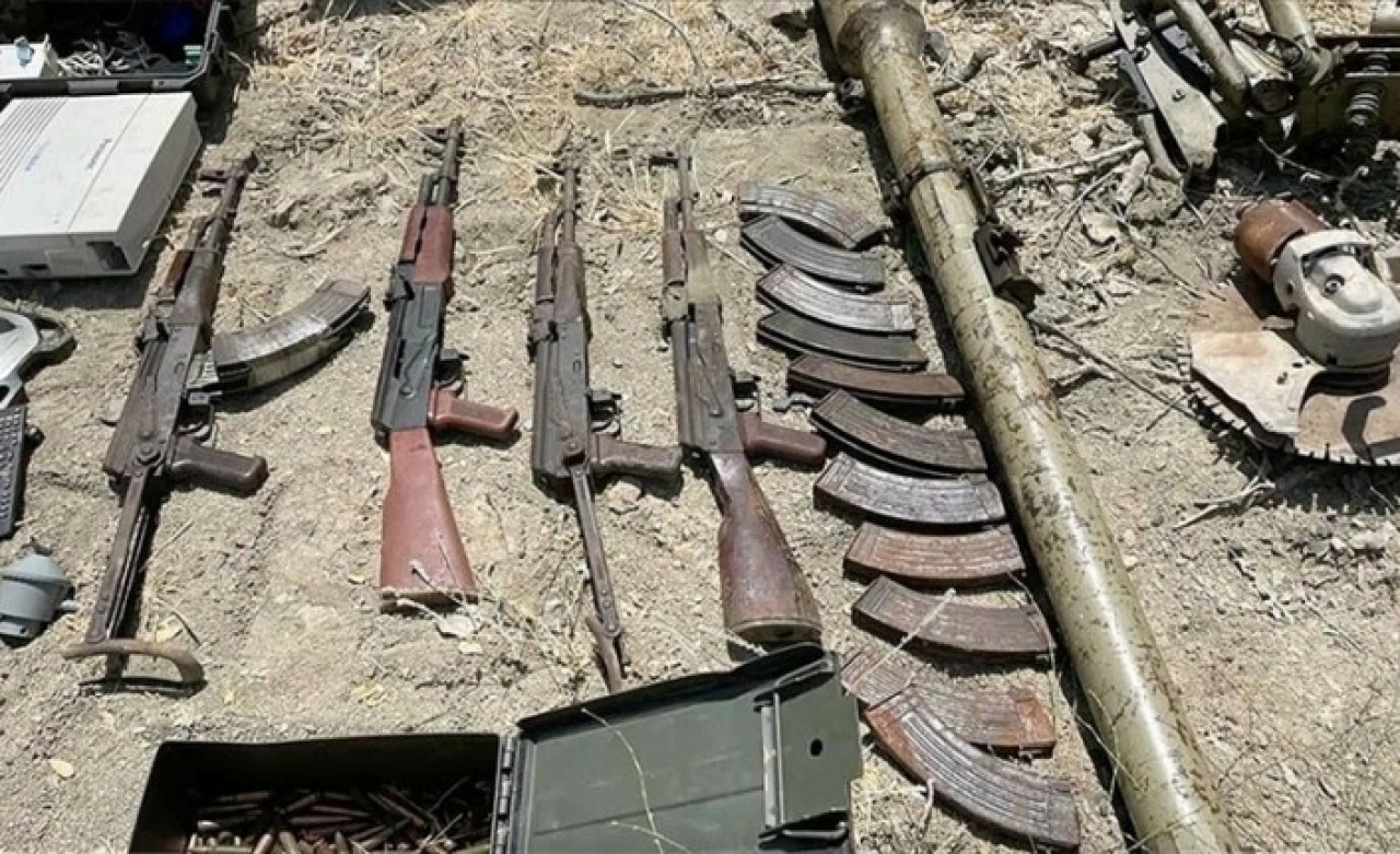 "7.62 mm PKMS makineli tüfek, 900 adet 7.62 mm PKMS makineli tüfek mühimmatı, 2 adet 7.62 mm PKMS makineli tüfek yedek namlusu, 2000 adet Doçka makineli tüfek mühimmatı, 4 adet AK 47 piyade tüfeği ve 23 adet şarjörü, 22 sandık açılmamış piyade tüfeği mühimmatı, 2 adet RPG-7 roketatar, 21 adet RPG-7 roketatar mühimmatı, 16 adet RPG-7 roketatar sevk fişeği, 27 adet SPG-9 roket sevk fişeği, 13 adet 82 mm havan mühimmatı, 84 adet bombaatar mühimmatı, 1000 adet 5.45 mm mühimmat, 57 mm geri tepmesiz top ve 1 adet sehpası, 2 adet M-16 şarjörü, antitank mayını, 10 adet aydınlatma mayını, 12 adet sis bombası, 24 adet 82 mm hassas tapası, 150 m infilaklı fitil, 250 m saniyeli fitil, 2 adet hazırlanmış el yapımı patlayıcı (EYP) düzeneği, 30 adet EYP yapımında kullanılan devre düzeneği, 20 kilogram amonyum nitrat, 100 elektrikli fünye, 40 fünye, 4 gaz maskesi ve 15 filtre,
