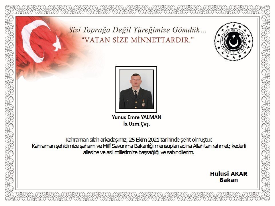 Milli Savunma Bakanı Hulusi Akar, başsağlığı mesajında “Kahraman silah arkadaşımız, 25 Ekim 2021 tarihinde şehit olmuştur. Kahraman şehidimize şahsım ve Milli Savunma Bakanlığı mensupları adına Allah’tan rahmet, kederli ailesine ve asil milletimize başsağlığı ve sabır dilerim” ifadelerini kullandı.
