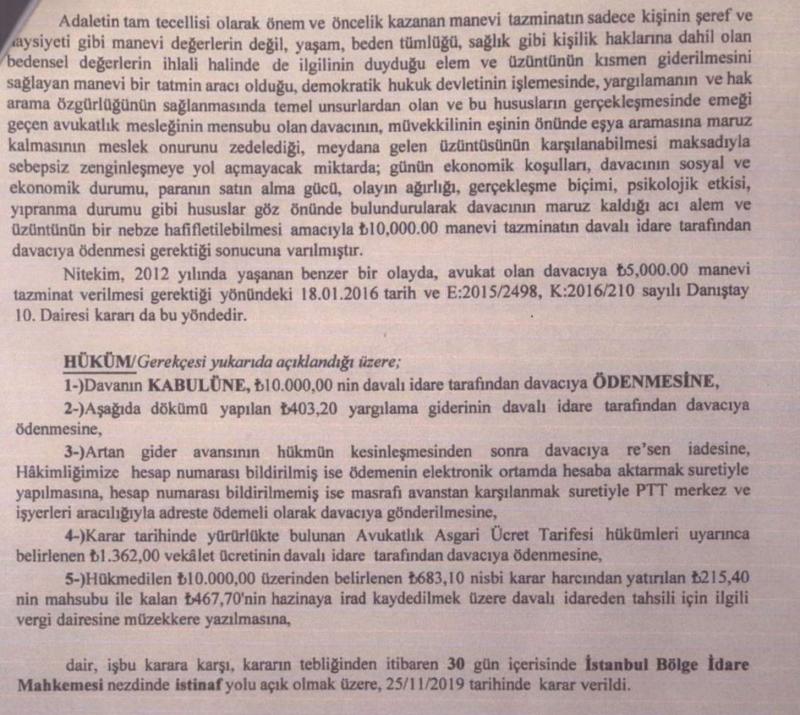 Adaletin tam tecellisi olarak önem ve öncelik kazanan manevi tazminatın sadece kişinin şeref ve haysiyeti gibi manevi değerlerin değil, yaşam, beden tümlüğü, sağlık gibi kişilik haklarına dahil olan bedensel değerlerin ihlali halinde de ilgilinin duyduğu elem ve üzüntünün kısmen giderilmesini sağlayan manevi bir tatmin aracı olduğu, demokratik hukuk devletinin işlemesinde, yargılamanın ve hak arama özgürlüğünün sağlanmasında temel unsurlardan olan ve bu hususların gerçekleşmesinde emeği geçen avukatlık mesleğinin mensubu olan davacının, müvekkilinin eşinin önünde eşya aramasına maruz kalmasının meslek onurunu zedelediği, meydana gelen üzüntüsünün karşılanabilmesi maksadıyla sebepsiz zenginleşmeye yol açmayacak miktarda; günün ekonomik koşulları, davacının sosyal ve ekonomik durumu, paranın satın alma gücü, olayın ağırlığı, gerçekleşme biçimi, psikolojik etkisi, yıpranma durumu gibi hususlar göz önünde bulundurularak davacının maruz kaldığı acı, elem ve üzüntünün bir nebze hafifletilmesi amacıyla 10 bin Türk Lirası tazminatın davalı idare tarafından davacıya ödenmesi gerektiği sonucuna varılmıştır.