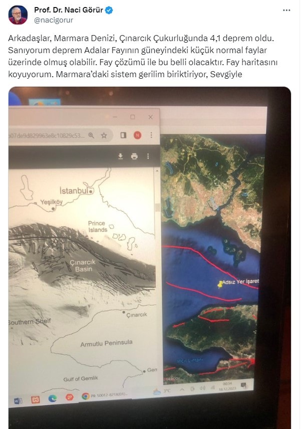 "Marmara Denizi, Çınarcık Çukurluğunda 4, 1 deprem oldu. Sanıyorum deprem Adalar Fayının güneyindeki küçük normal faylar üzerinde olmuş olabilir. Fay çözümü ile bu belli olacaktır. Fay haritasını koyuyorum. Marmara’daki sistem gerilim biriktiriyor"