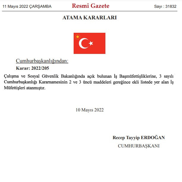 Cumhurbaşkanı Erdoğan imzasıyla yayımlanan kararlara göre, Çalışma ve Sosyal Güvenlik Bakanlığında açık bulunan iş başmüfettişliklerine 208 iş müfettişinin ataması yapıldı.