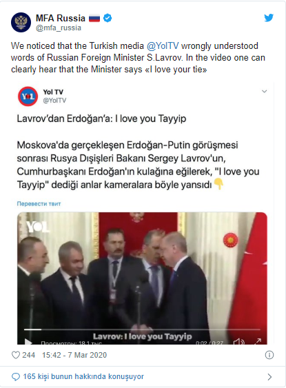 Yol TV'nin haberini alıntılayan bakanlık, Lavrov'un Cumhurbaşkanı Erdoğan'a ''I love your tie'' (Kravatına bayıldım) dediğini belirtti.