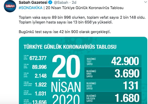 Türkiye ile ilgi koronavirüs verileri Sağlık Bakanı Fahrettin Koca tarafıdan paylaşılırken bu kez ilginç bir olay yaşandı. Turkuvaz Medya Grubu'na ait olan Sabah Gazetesi 20 Nisan koronavirüs verilerini Sağlık Bakanı Fahrettin Koca'dan önce paylaştı. Twitter hesabından paylaşımda bulunan Sabah Gazetesi daha sonra paylaşımını kaldırdı.