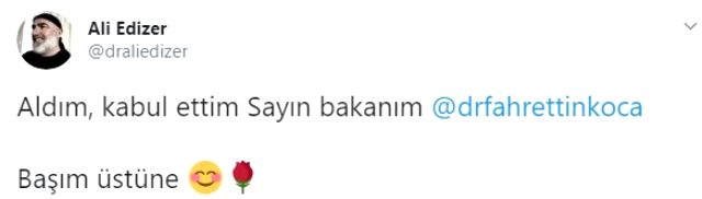 vTwitter hesabından paylaşım yapan Ali Edizer'in, Sağlık Bakanı Fahrettin Koca'yı etiketleyerek "Aldım, kabul ettim Sayın Bakanım. Başım üstüne" yazması şaşkınlık yarattı.