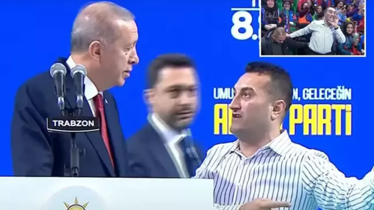 Bir vatandaş ısrarla sahneye çıkmak istedi. Cumhurbaşkanı Erdoğan, vatandaşın isteğini kırmadı. Sahneye çıkan vatandaş, Erdoğan'a yüksek sesle bir şeyler söyledikten sonra elini öptü.