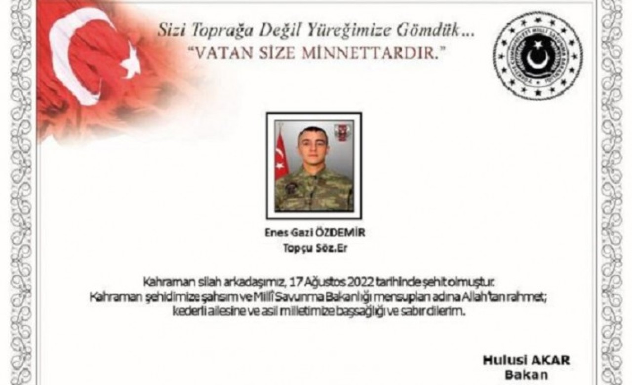 Milli Savunma Bakanlığı'ndan yapılan son açıklamada ise yaralı askerlerimizden birinin daha şehit olduğu duyuruldu. Açıklamada, "Birecik/Şanlıurfa hududunda, 16 Ağustos 2022 tarihinde, teröristlerce yapılan havan tacizi sonucunda yaralanarak hastaneye sevk edilen kahraman silah arkadaşımız Topçu Söz. Er Enes Gazi Özdemir, yapılan tüm müdahalelere rağmen kurtarılamayarak 17 Ağustos 2022 tarihinde şehit olmuştur. Bizleri derin bir acı ve üzüntüye boğan bu olayda hayatını kaybeden aziz şehidimize Allah'tan rahmet, kederli ailesine, Türk Silahlı Kuvvetleri ile asil milletimize başsağlığı ve sabır dileriz." ifadeleri yer aldı.