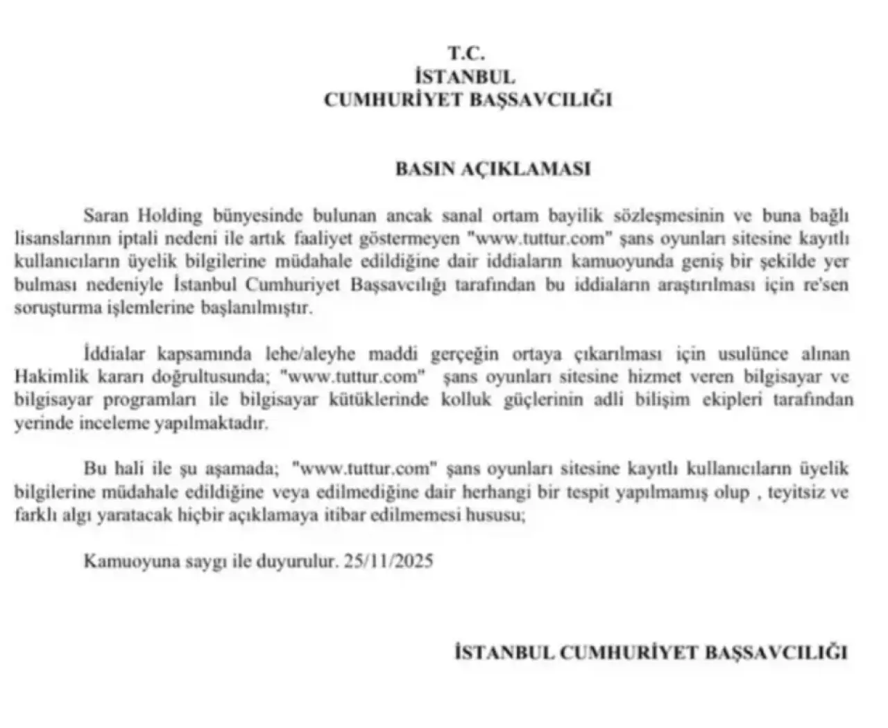 "Saran Holding bünyesinde bulunan ancak sanal ortam bayilik sözleşmesinin ve buna bağlı lisanslarının iptali nedeni ile artık faaliyet göstermeyen "www.tuttur.com" şans oyunları sitesine kayıtlı kullanıcıların üyelik bilgilerine müdahale edildiğine dair iddiaların kamuoyunda geniş bir şekilde yer bulması nedeniyle İstanbul Cumhuriyet Başsavcılığı tarafından bu iddiaların araştırılması için re'sen soruşturma işlemlerine başlanılmıştır.