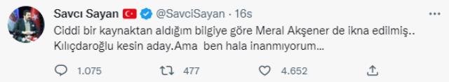 Sayan, Kılıçdaroğlu'nun adaylığıyla ilgili İYİ Parti Genel Başkanı Meral Akşener'in ikna edildiğini iddia etti. Sosyal medya hesabından açıklama yapan Sayan, ''Ciddi bir kaynaktan aldığım bilgiye göre Meral Akşener de ikna edilmiş.. Kılıçdaroğlu kesin aday. Ama ben hala inanmıyorum…' ifadelerine yer verdi.