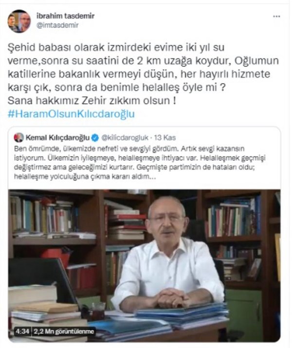Şehiit babası İbrahim Taşdemir Kılıçdaroğlu’nun helalleşme açıklamasına tepki göstererek “Şehid babası olarak İzmir’deki evime iki yıl su verme, sonra su saatini de 2 km uzağa koydur, Oğlumun katillerine bakanlık vermeyi düşün, her hayırlı hizmete karşı çık, sonra da benimle helalleş öyle mi? "HaramOlsunKılıçdaroğlu" dedi.
