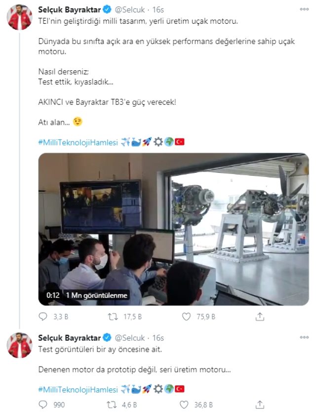 Bayraktar, "TEI'nin geliştirdiği milli tasarım, yerli üretim uçak motoru. Dünyada bu sınıfta açık ara en yüksek performans değerlerine sahip uçak motoru. Nasıl derseniz; test ettik, kıyasladık... AKINCI ve Bayraktar TB3'e güç verecek! Atı alan..." ifadelerini kullandı.
