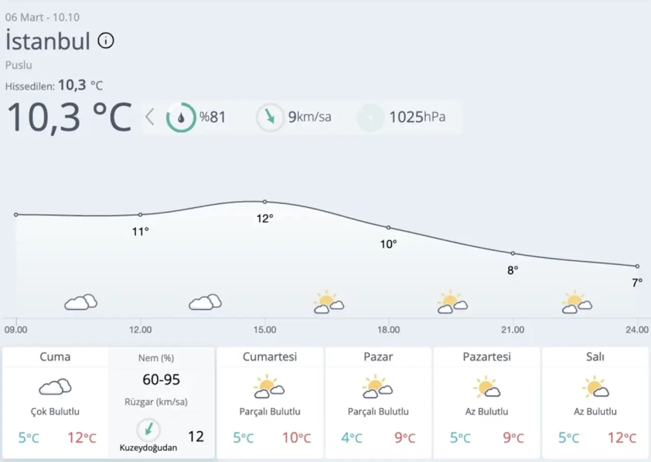 İstanbul'da bu hafta sonu hava durumu, 6 Mart Cuma günü puslu güneşle başlayacak. 7 Mart Cumartesi günü ise kısmen güneşli bir atmosfer hakim olacak. 8 Mart Pazar günü ise güneşin daha fazla yüzünü göstereceği, parçalı bulutlu bir hava bekleniyor. İstanbullular, bu hafta sonu aktivitelerini açık havada geçirebilirler.