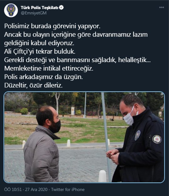 Emniyet Genel Müdürlüğü’nün Twitter’daki hesabından yapılan açıklamada, Ali Çiftçi’den özür dilendi. Açıklamada, “Polisimiz burada görevini yapıyor. Ancak bu olayın içeriğine göre davranmamız lazım geldiğini kabul ediyoruz. Ali Çiftçiyi tekrar bulduk. Gerekli desteği ve barınmasını sağladık, helalleştik… Memleketine intikal ettireceğiz. Polis arkadaşımız da üzgün. Düzeltir, özür dileriz” denildi.