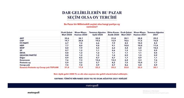 MetroPoll Araştırma Şirketi Başkanı Özer Sencar, sosyal medya hesabından dar gelirli vatandaşlar arasında yapılan anketin sonuçlarını paylaştı. Aylık geliri 3000 TL ve altı seçmenlere yönelik gerçekleştirilen araştırmada "Bu pazar bir milletvekili seçimi olsa hangi partiye oy verirsiniz?" sorusu soruldu.