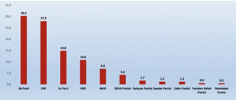 "Bu Pazar genel seçim olsa oyunuzu hangi partiye verirsiniz? sorusuna verilen yanıtlar şöyle dağıldı: AK Parti yüzde 30.2, CHP yüzde 27.9, İYİ Parti yüzde 14.8, MHP'nin oy oranı ise yüzde 6.9 oldu. Katılımcıların yüzde 4, 2'si DEVA Partisi, yüzde 1, 7'si Gelecek Partisi'ni seçti.