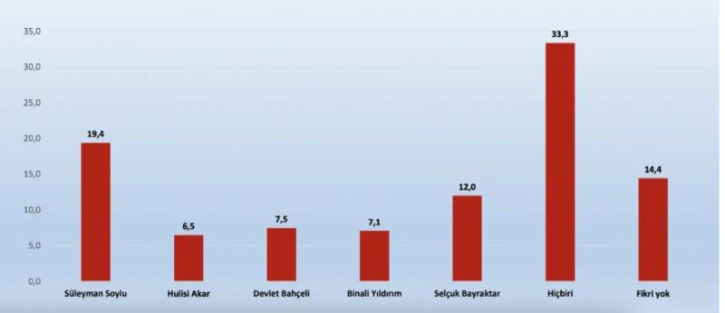 Katılımcılara "Recep Tayyip Erdoğan’ın Cumhur İttifakı’nın cumhurbaşkanı adayı olmaması durumunda aşağıdaki isimlerden hangisinin cumhurbaşkanı adayı olmasını istersiniz?" sorusu da yöneltildi. Yüzde 33.3'ü 'Hiç kimse' derken, sorulan isimler arasında en yüksek oyu yüzde 19.4 ile Süleyman Soylu aldı. Yüzde 14, 4 'Fikrim yok' derken, katılımcıların yüzde 12'si Selçuk Bayraktar'ı, yüzde 7, 5'i Devlet Bahçeli'yi seçti. Binali Yıldırım yüzde 7, 1, Hulusi Akar ise yüzde 6, 5 oranında tercih edildi.