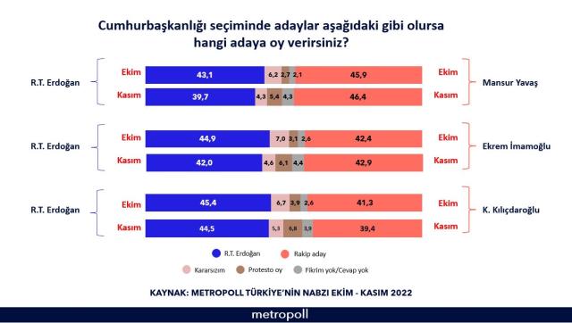 Türkiye seçimlere doğru giderken araştırma şirketleri de anketlere hız verdi. Metropoll Araştırma son anketi Cumhurbaşkanlığı seçimlerine yönelik yaptı. Ankette Cumhurbaşkanı Erdoğan'ın karşısına, 6'lı masanın adayı olarak isimleri öne çıkan CHP lideri Kemal Kılıçdaroğlu, İstanbul Büyükşehir Belediye Başkanı Ekrem İmamoğlu ve Ankara Büyükşehir Belediyesi Mansur Yavaş çıkartıldı.
