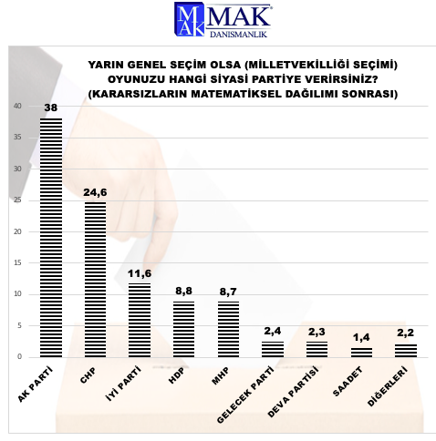MAK Danışmanlık 2 bin 850 kişiyle yaptığı anket sonuçlarını yayınladı. 30’u büyükşehir olmak üzere 61 ilde yapılan anket sonucunda, kararsız seçmenin oyu matematiksel olarak dağıldıktan sonra Cumhuriyet Halk Partisi yüzde 24.6 oy alırken İYİ Parti’nin oyu ise yüzde 11.6 olarak açıklandı.