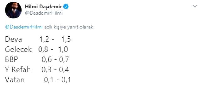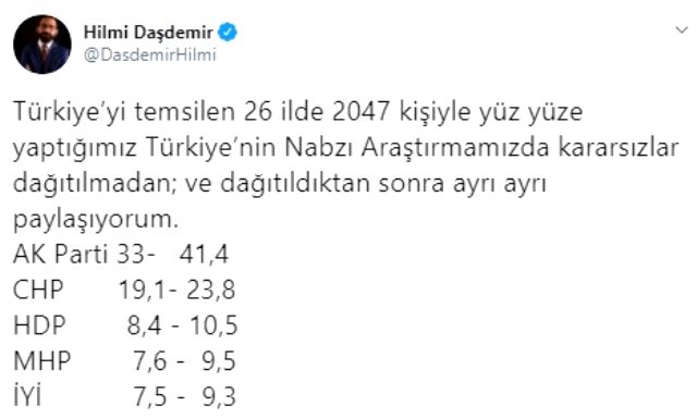 Optimar Başkanı Hilmi Taşdemir, anket sonuçlarını Twitter hesabından paylaştı.