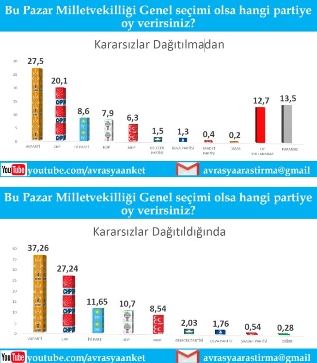 Genel seçimlere yönelik ankette yurttaşların yüzde 27, 5’i AKP'ye oy vereceğini belirtirken, CHP’nin oy oranı ise yüzde 20, 1 olarak belirtildi. Kararsızlar dağıtıldığında ise AKP'nin oy oranı yüzde 37, 26'ya, CHP'nin oy oranı ise yüzde 27, 24'e çıkıyor.