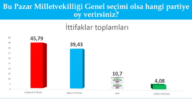 Ankete göre, Milletvekilliği Genel Seçimi'nde Cumhur İttifakı yüzde 45, 79 oranında görülürken, Millet İttifakı yüzde 39, 43 olarak görülüyor.