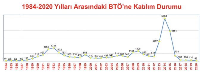 İçişleri Bakanı Süleyman Soylu, "Türkiye'nin topyekun PKK ile mücadelesinin geldiği nokta" başlığıyla Twitter hesabından 1984-2020 yıllarındaki bölücü terör örgütüne katılım durumuna ilişkin grafiği paylaştı.
