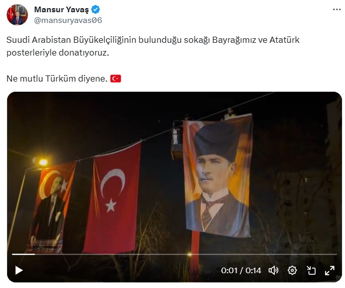 Yavaş, "Suudi Arabistan Büyükelçiliğinin bulunduğu sokağı Bayrağımız ve Atatürk posterleriyle donatıyoruz. Ne mutlu Türküm diyene" ifadesini kullandı.