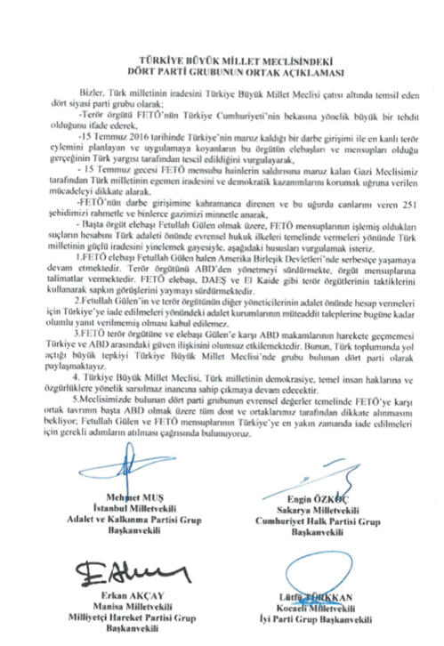 AK Parti, CHP, MHP ve İYİ Parti TBMM grupları ortak açıklamasından: "FETÖ elebaşı Gülen, terör örgütünü ABD'den yönetmeyi sürdürmekte, DEAŞ ve El Kaide gibi terör örgütlerinin taktiklerini kullanarak sapkın görüşlerini yaymaya devam etmektedir. FETÖ ve elebaşı Gülen'e karşı ABD makamlarının harekete geçmemesi, Türkiye ve ABD arasındaki güven ilişkisini olumsuz etkilemektedir. Bunun Türk toplumunda yol açtığı büyük tepkiyi TBMM'de grubu bulunan 4 parti olarak paylaşmaktayız"