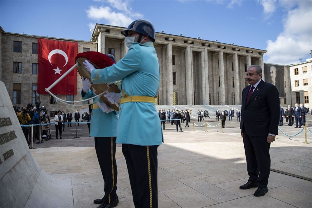 - İlk tören Meclisteki Atatürk Anıtı önünde düzenlendi. Törende, TBMM Başkanı Mustafa Şentop'un Atatürk Anıtı'na kırmızı ve beyaz karanfillerden oluşan çelenk bırakmasının ardından saygı duruşunda bulunuldu, İstiklal Marşı okundu.