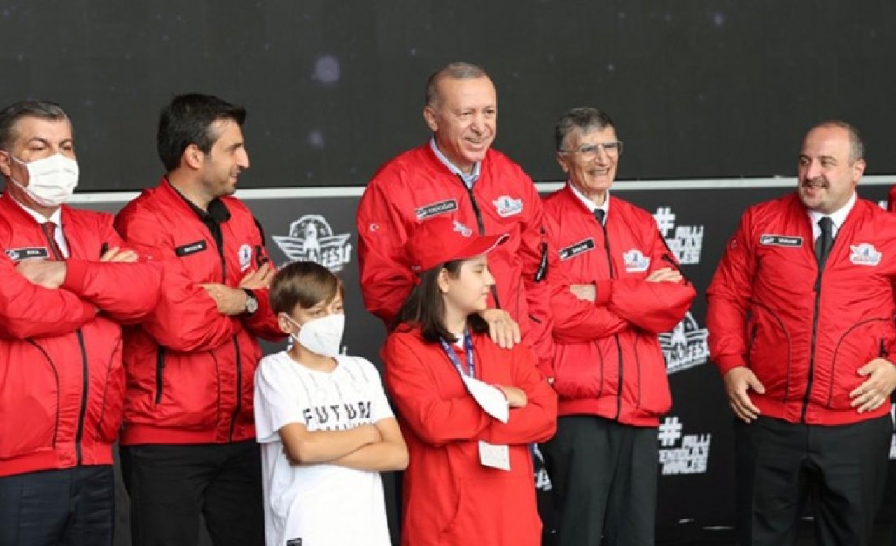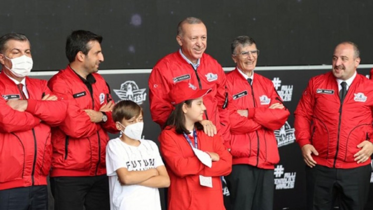Tören sonunda Erdoğan, bakanlar, Aziz Sancar ve TEKNOFEST Yönetim Kurulu Başkanı Selçuk Bayraktar sahneye çıkarak katılımcıları selamladı ve fotoğraf çektirildi. O anlarda ise dikkat çeken bir gelişme yaşandı.