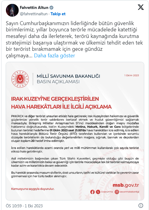 ''PKK/KCK ve diğer terörist unsurları etkisiz hale getirerek; Irak Kuzeyinden halkımıza ve güçlerimize yönelik terör saldırılarını bertaraf etmek ve hudut güvenliğimizi maksadıyla; Birleşmiş Milletler Anlaşması’nın 51’inci maddesinden doğan meşru haklarımız doğrultusunda, Irakin Kuzeyindeki Metina, Hakurk, Kandil ve Gara bulunan terörist hedeflerine 01 Ekim 2023 saat 21.00’da hava harekâtları icra edilmiş, hava harekâtlarıyla Bölücü Terör Örgütü (BTÖ) tarafından kullanılan ve içerisinde düzeyde teröristlerin de bulunduğu değerlendirilen mağara, sığınak, barınak ve oluşan toplam 20 hedef imha edilmiştir''