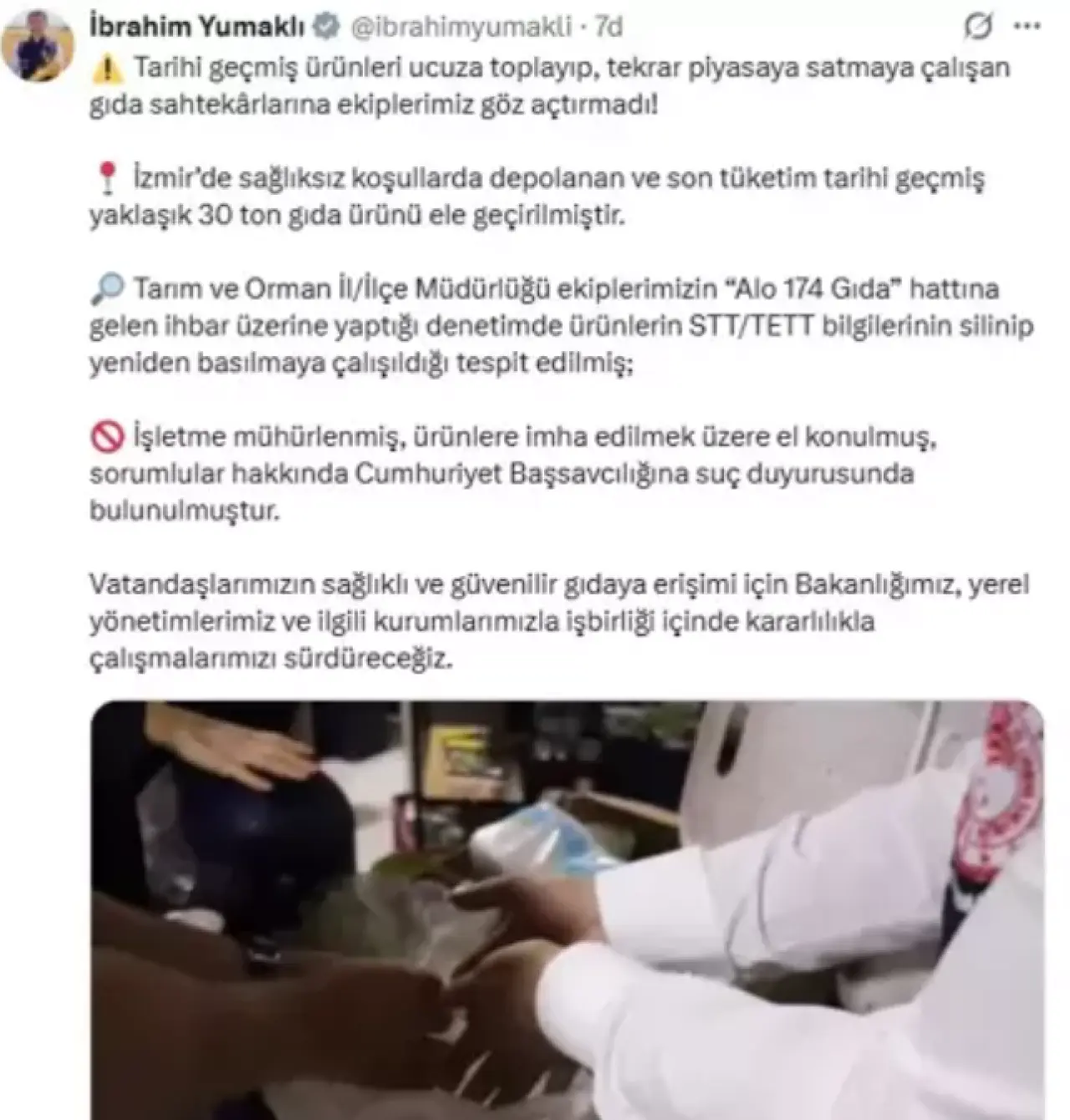 “Tarihi geçmiş ürünleri ucuza toplayıp, tekrar piyasaya satmaya çalışan gıda sahtekarlarına ekiplerimiz göz açtırmadı. İzmir'de sağlıksız koşullarda depolanan ve son tüketim tarihi geçmiş yaklaşık 30 ton gıda ürünü ele geçirilmiştir. Tarım ve Orman İl/İlçe Müdürlüğü ekiplerimizin 'Alo 174 Gıda' hattına gelen ihbar üzerine yaptığı denetimde ürünlerin STT/TETT bilgilerinin silinip yeniden basılmaya çalışıldığı tespit edilmiş, işletme mühürlenmiş, ürünlere imha edilmek üzere el konulmuş, sorumlular hakkında Cumhuriyet Başsavcılığına suç duyurusunda bulunulmuştur. Vatandaşlarımızın sağlıklı ve güvenilir gıdaya erişimi için bakanlığımız, yerel yönetimlerimiz ve ilgili kurumlarımızla işbirliği içinde kararlılıkla çalışmalarımızı sürdüreceğiz.”