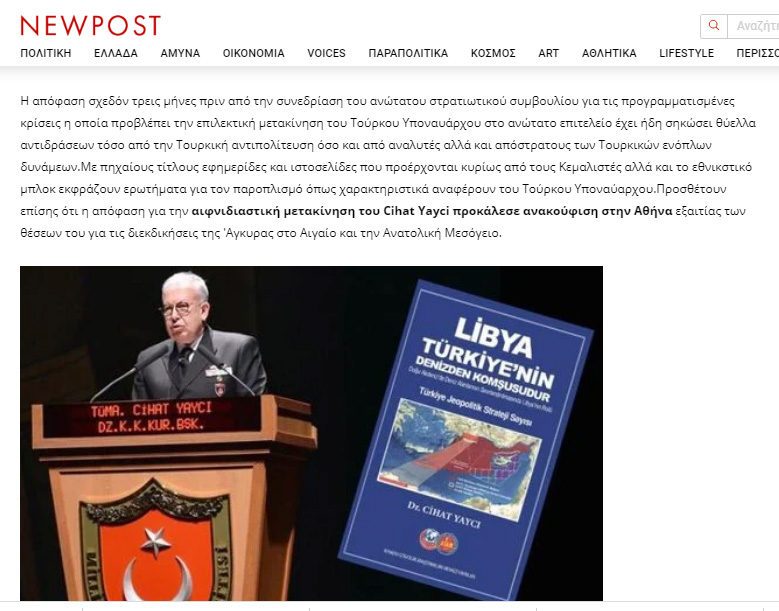 Yunanistan'ın büyük tepki gösterdiği Libya Anlaşmasının mimarı Tümamiral Cihat Yaycı’nın pasif göreve atanmasıyla ilgili Yunan sitesi Newpost haberde, "Atama Atina'yı rahatlattı" ifadesine yer verdi.