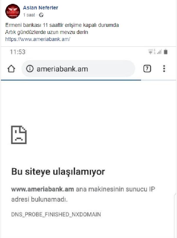 Azerbaycan-Ermenistan hattında sıcak çatışmaların 4'üncü gününe girilirken, 'Aslan Neferler Timi' adlı Türk hacker grubu, Amerika Birleşik Devletleri'nden gönderilen yardımların toplandığı iddia edilen ve merkezi Ermenistan'ın başkenti Erivan'da bulunan bir bankanın resmi web sitesini erişime kapattı. Grup, resmi web sitesinin yanında bankanın mobil bankacılık hizmetini de erişime kapattı.