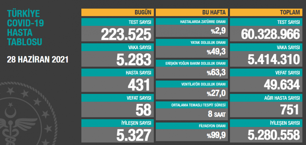 Bugünkü verilerle toplam test sayısı 60 milyon 328 bin 966, toplam vaka sayısı 5 milyon 414 bin 310, toplam vefat sayısı 49 bin 634, toplam ağır hasta sayısı 751, toplam iyileşen hasta sayısı ise 5 milyon 280 bin 558 oldu.