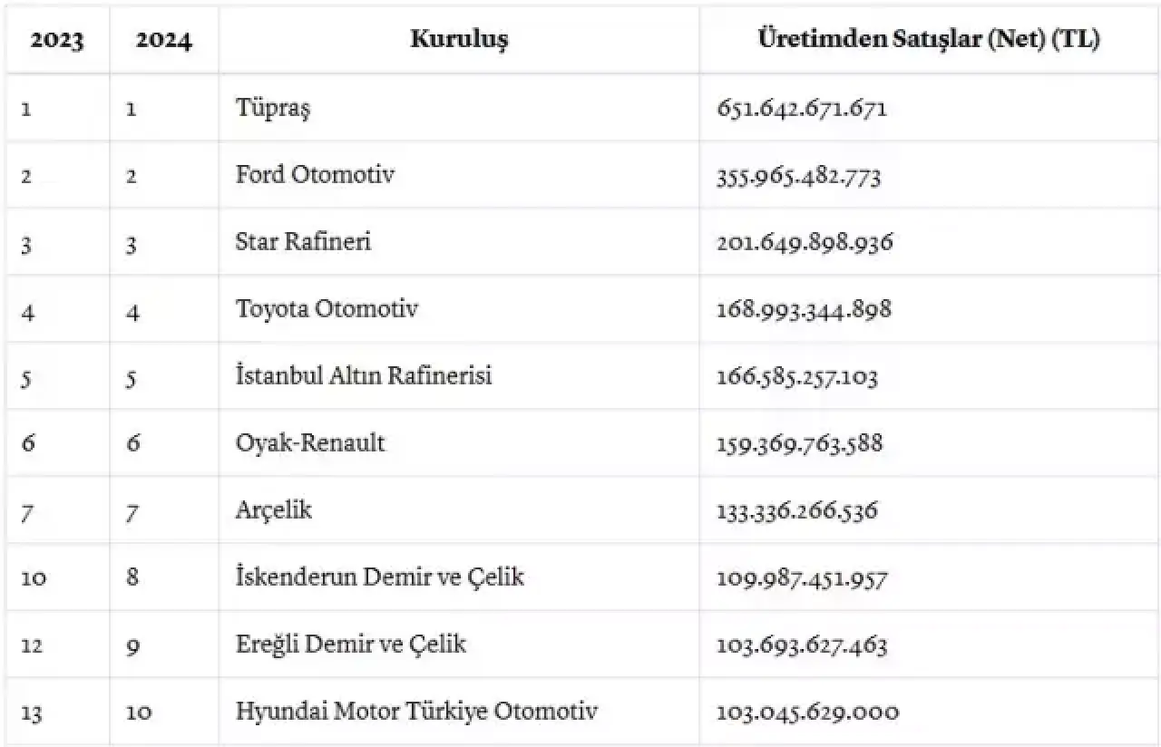 Listenin zirvesinde bu yıl da TÜPRAŞ yer aldı. Şirket, 651,6 milyar liralık üretimden satışla Türkiye’nin en büyük sanayi kuruluşu olmayı sürdürdü. Geçen yıl üçüncü sırada bulunan Ford Otomotiv, bu yıl 238 milyar lirayla ikinci sıraya yükselirken, 2022'nin ikincisi olan Star Rafineri ise 226,8 milyar lirayla üçüncü sıraya geriledi.
