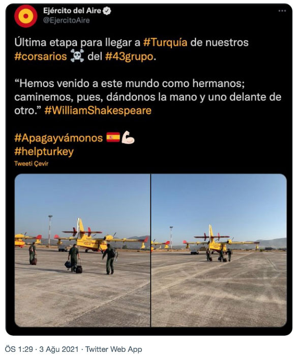İspanya Hava Kuvvetleri, yangın söndürme çalışmalarına destek olacak ekibini Türkiye'ye William Shakespeare'den bir alıntıyla uğurladı: