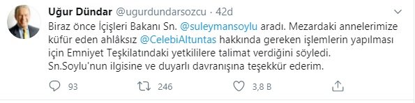 Dündar daha sonra attığı tweet’te ise “Biraz önce İçişleri Bakanı Sayın Süleyman Soylu aradı. Mezardaki annelerimize küfür eden ahlâksız Çelebi Altuntaş hakkında gereken işlemlerin yapılması için Emniyet teşkilatındaki yetkililere talimat verdiğini söyledi. Sayın Soylu’nun ilgisine ve duyarlı davranışına teşekkür ederim” ifadelerini kullandı.