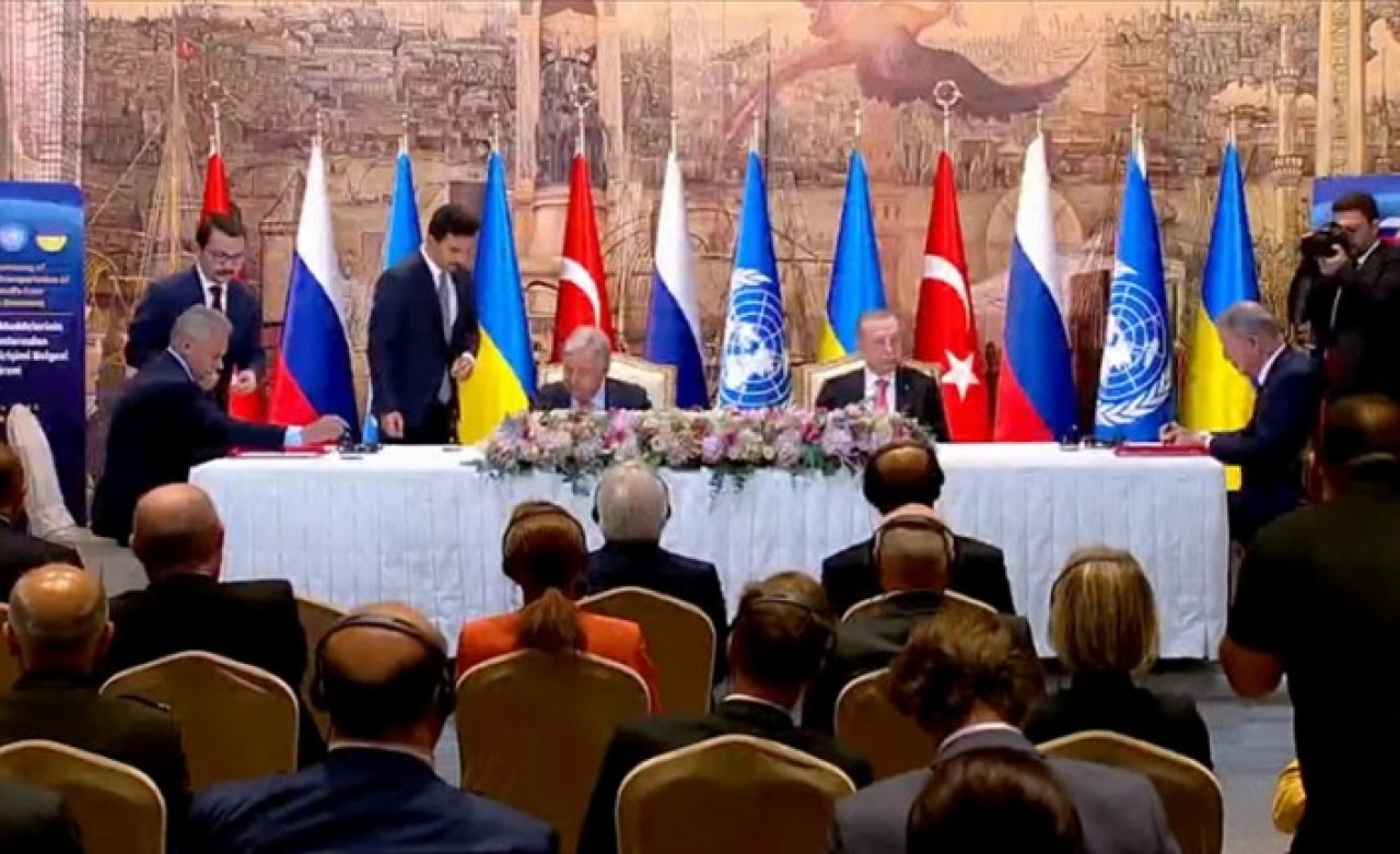 Cumhurbaşkanı Erdoğan ve BM Genel Sekreteri Guterres'in hazır bulunduğu, Ukrayna ve Rusya taraflarının katılımıyla Dolmabahçe Ofisi'nde Tahıl Sevkiyatı Anlaşması İmza Töreni düzenlendi.